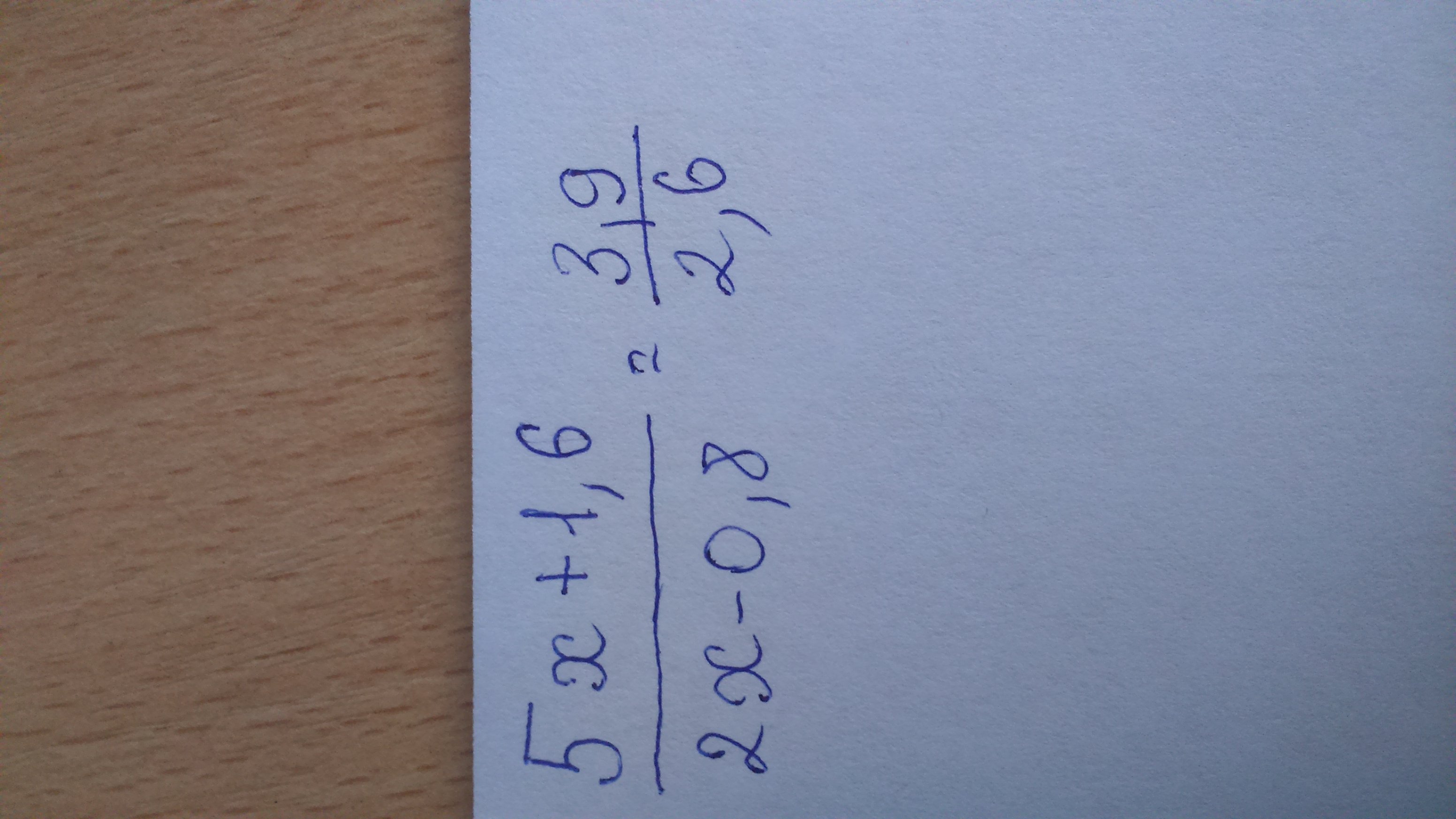 первым делом домножай первую дробь на 2,6, а вторую на 2х-0.8, тем самым избавишься от знаменателя, получаем 2.6(5x)+1.6*2.6=3.9(2x-0.8)