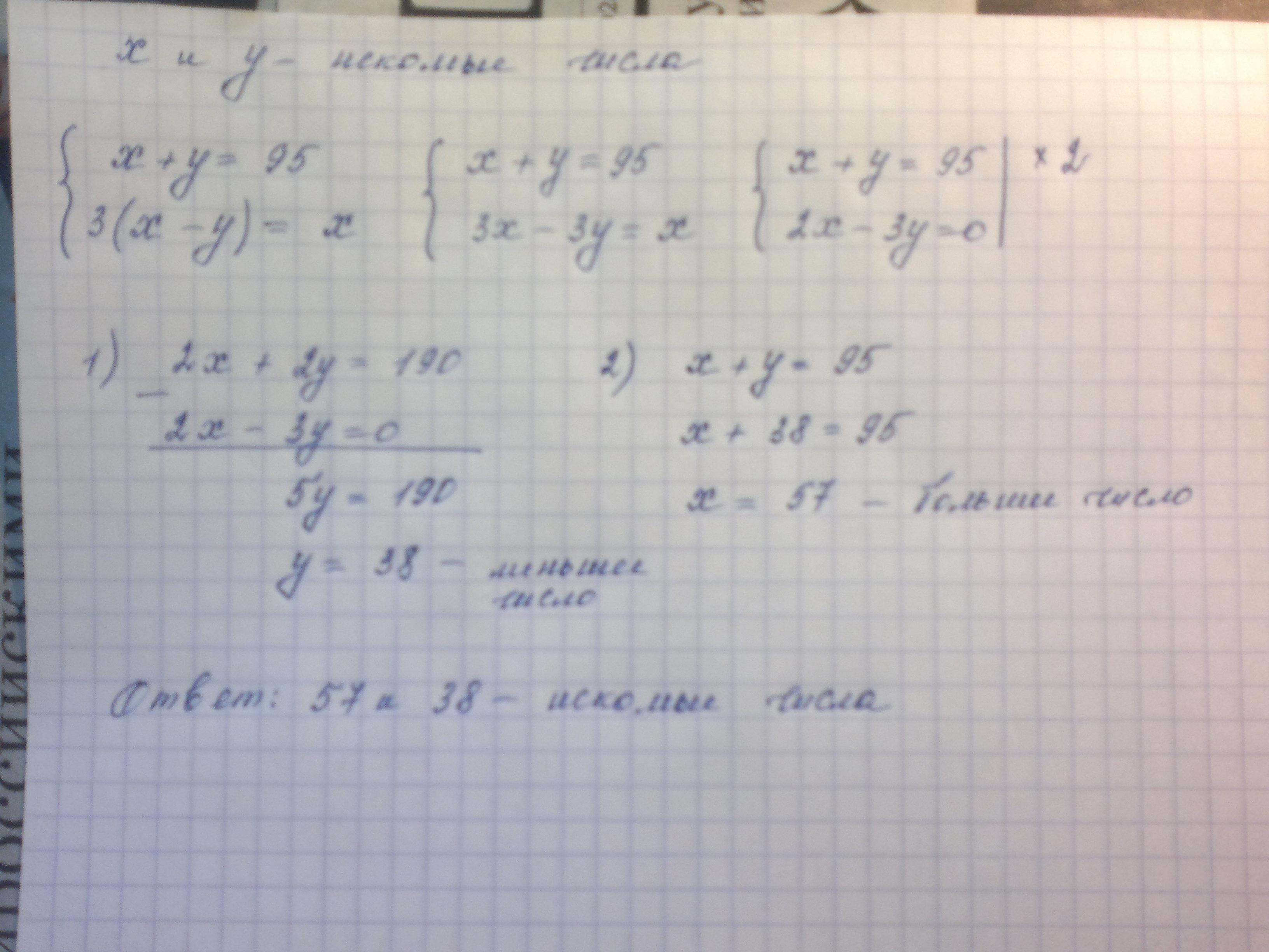 Сумма двух чисел равна 95, а их разность в 3 раза меньше, чем большее из этих чисел. Найди эти числа