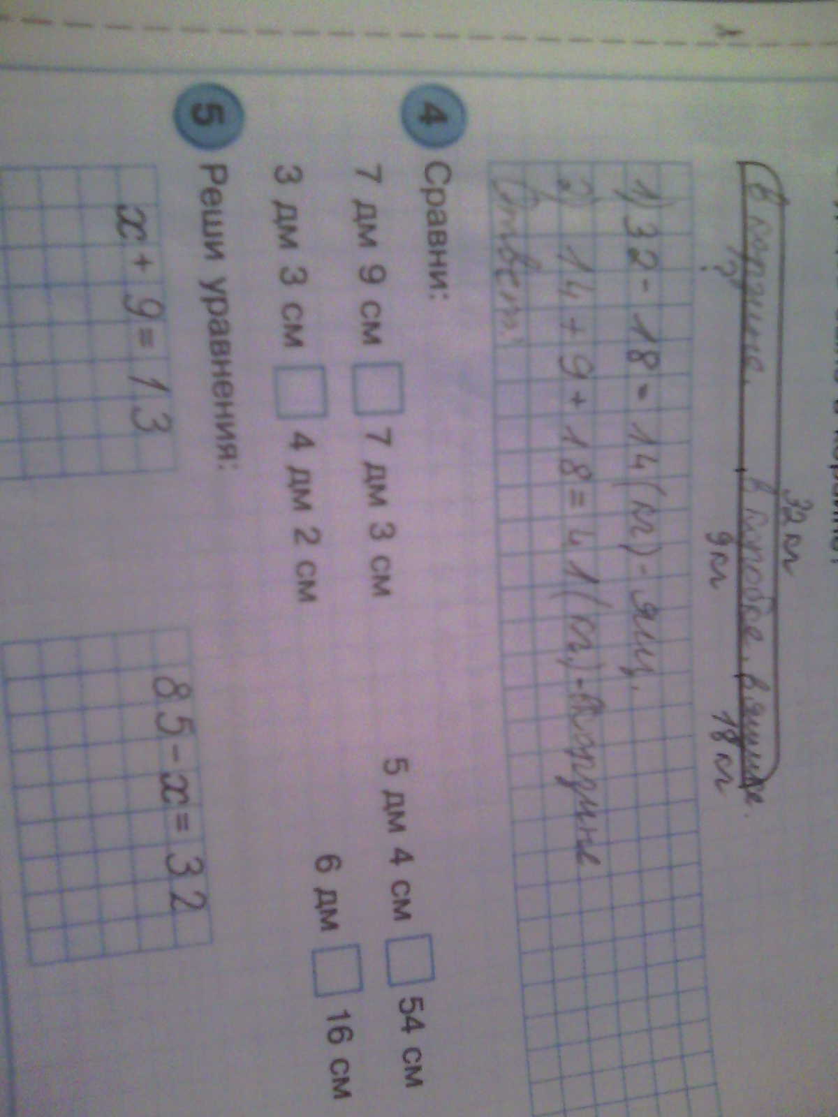 Задача в корзине, коробке и ящике было 32 кг огурцов. из них в ящике было 18 кг, а в коробке - 9 кг. сколько килограммов огурцов было в корзине. я правильно сделала?