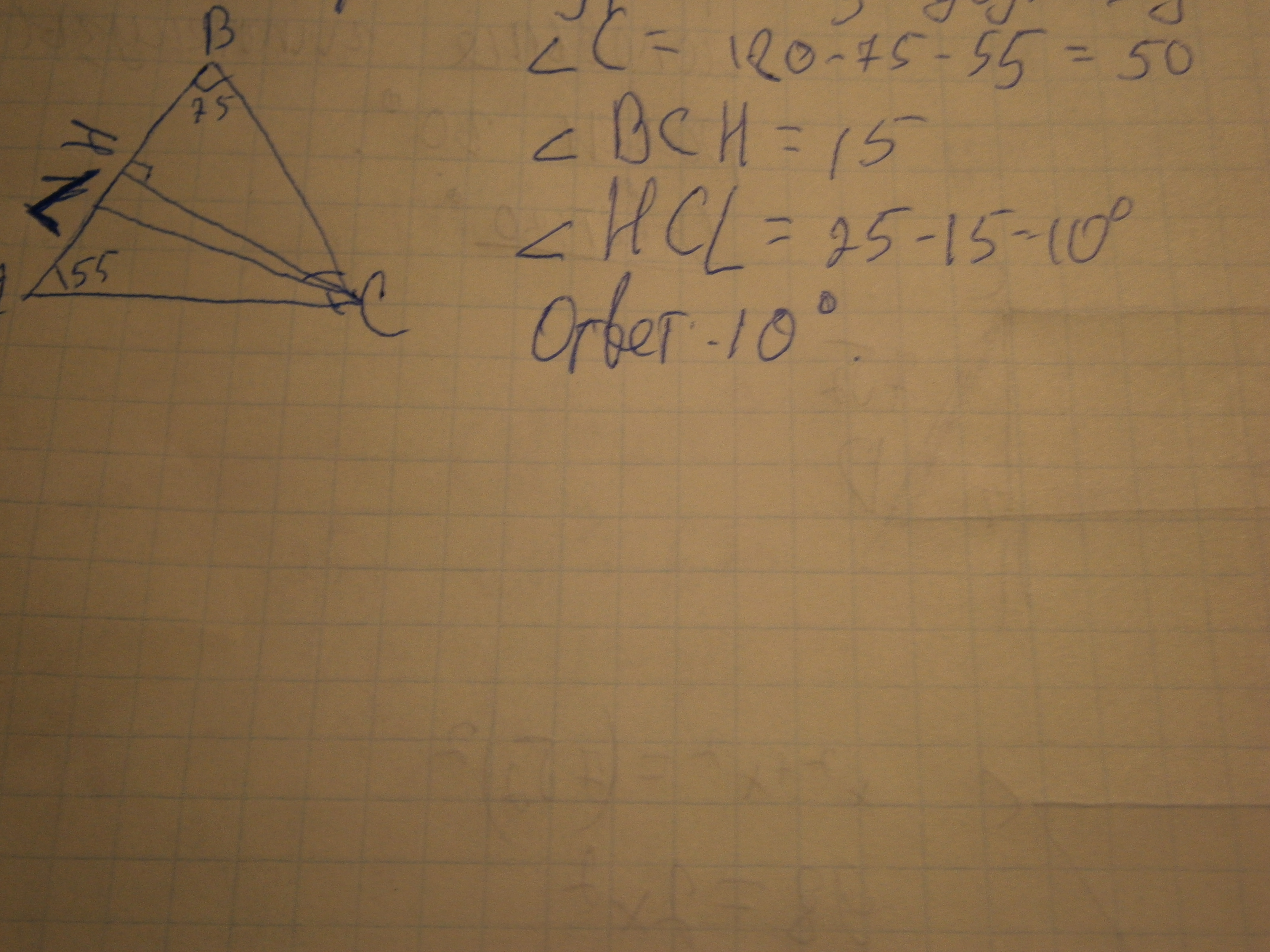 В треугольнике АВС известно, что угол А=55 градусов, угол В=75 градусов. Найдите угол между высотой и биссектрисой треугольника, проведёнными из вершины С.