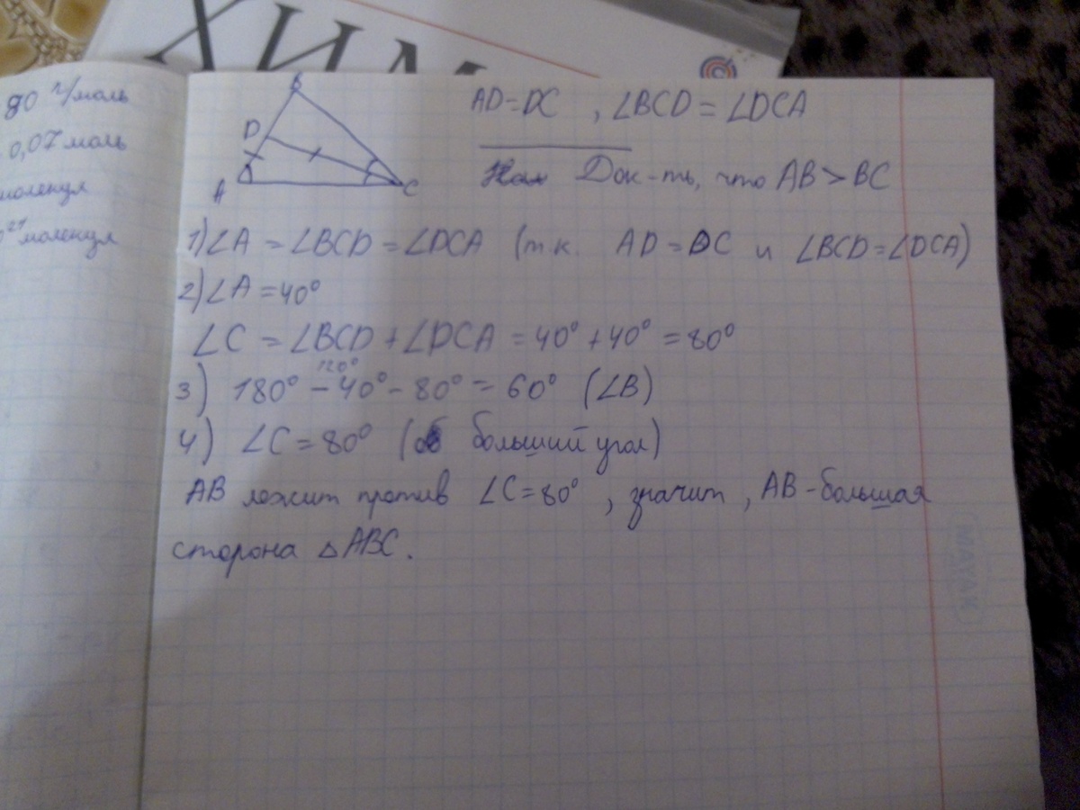 2)Биссектриса угла С треугольника АВС пересекает сторону АВ в точке D ,AD=DC,угол А=40градусов.Докажите ,что АВ больше ВС