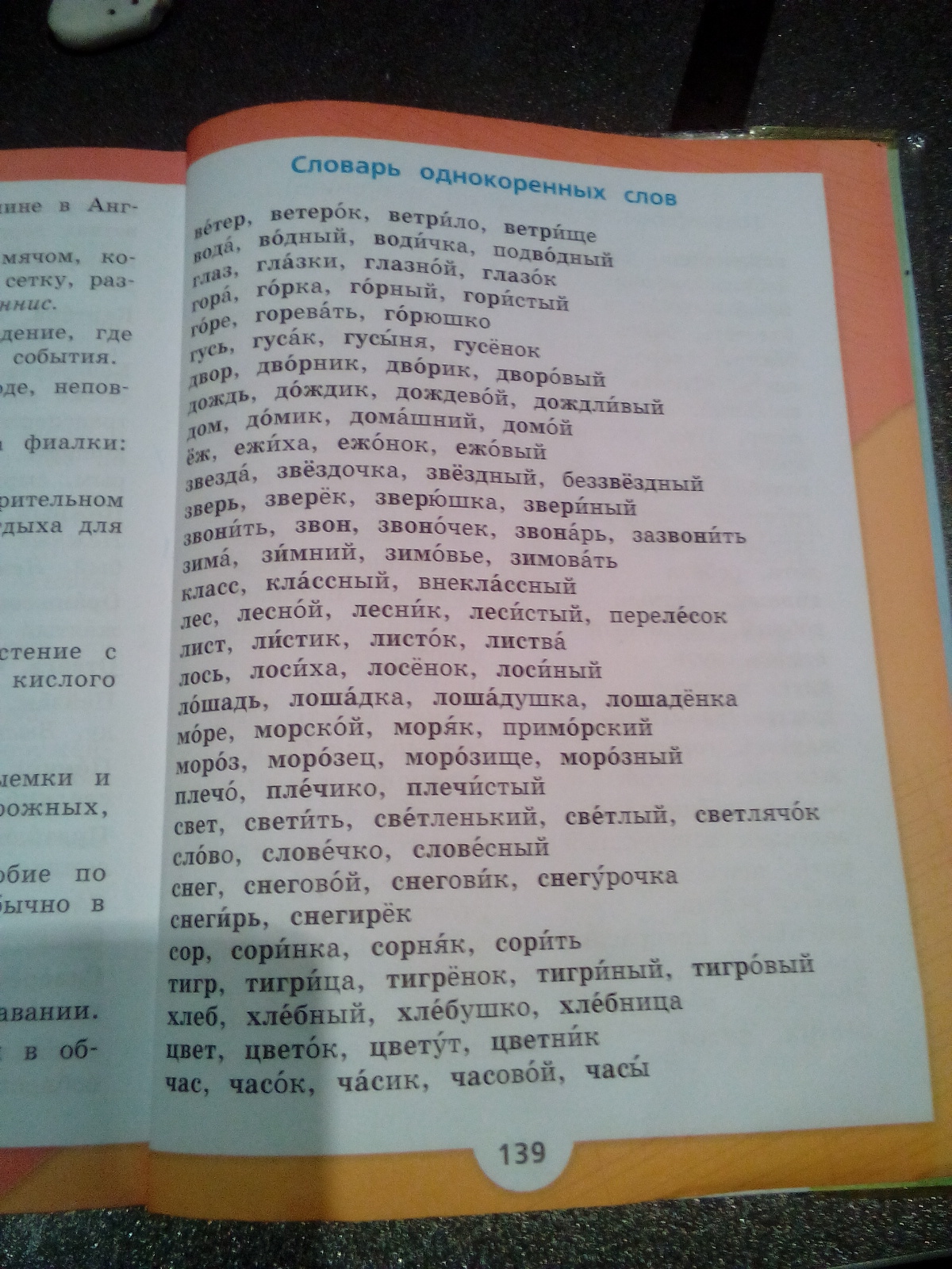 ;вода, водный, водичка, подводный; гора… ; звезда… ; зверь… ; звонить… ; лес… ; зима… ; лось… ; море... ; плечо...; свет...; слово...; сор...; цвет...; тигр...; час...; ветер...; горе... 2) глаз...; лошадь...; гусь...; дождь...; еж...; мороз...; снег...; хлеб... 3) класс-запомнить.