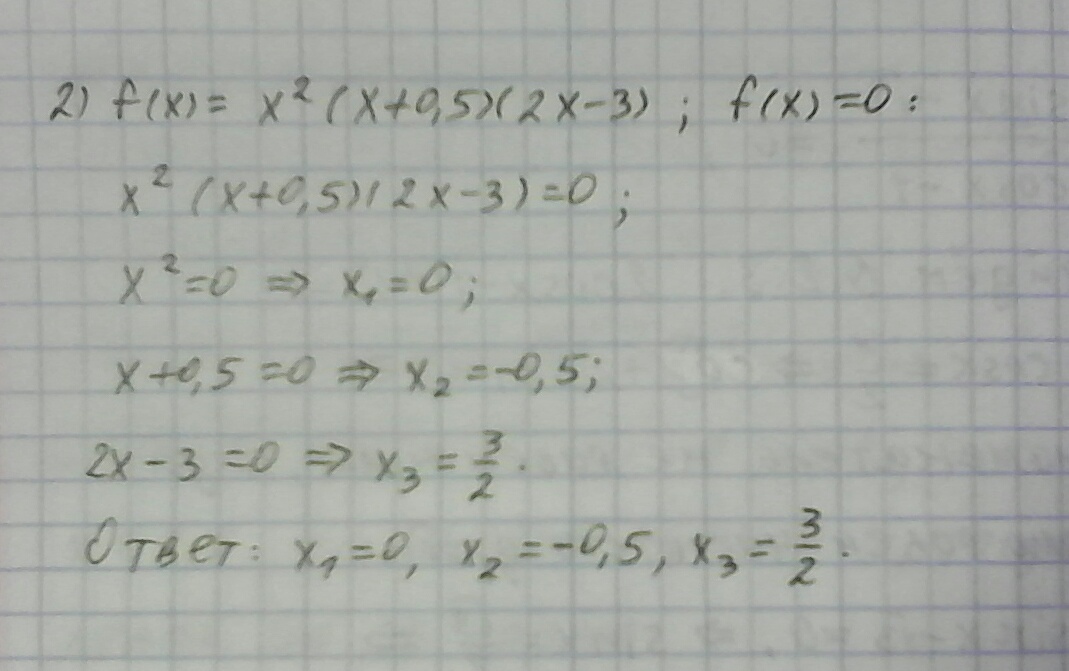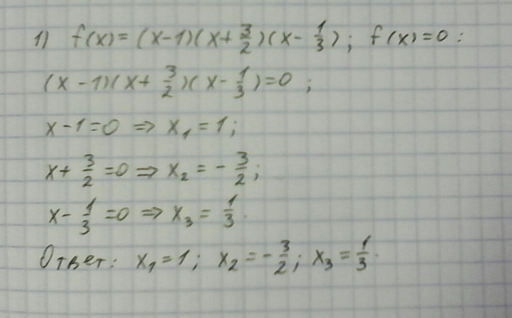 ПОЖАЛУЙСТА даю 22 балла завтра сдавать Найдите нули функции f(x)=(x-1)(x+3/2)(x-1/3) , f(x)=x^2(x+0,5)(2x-3)