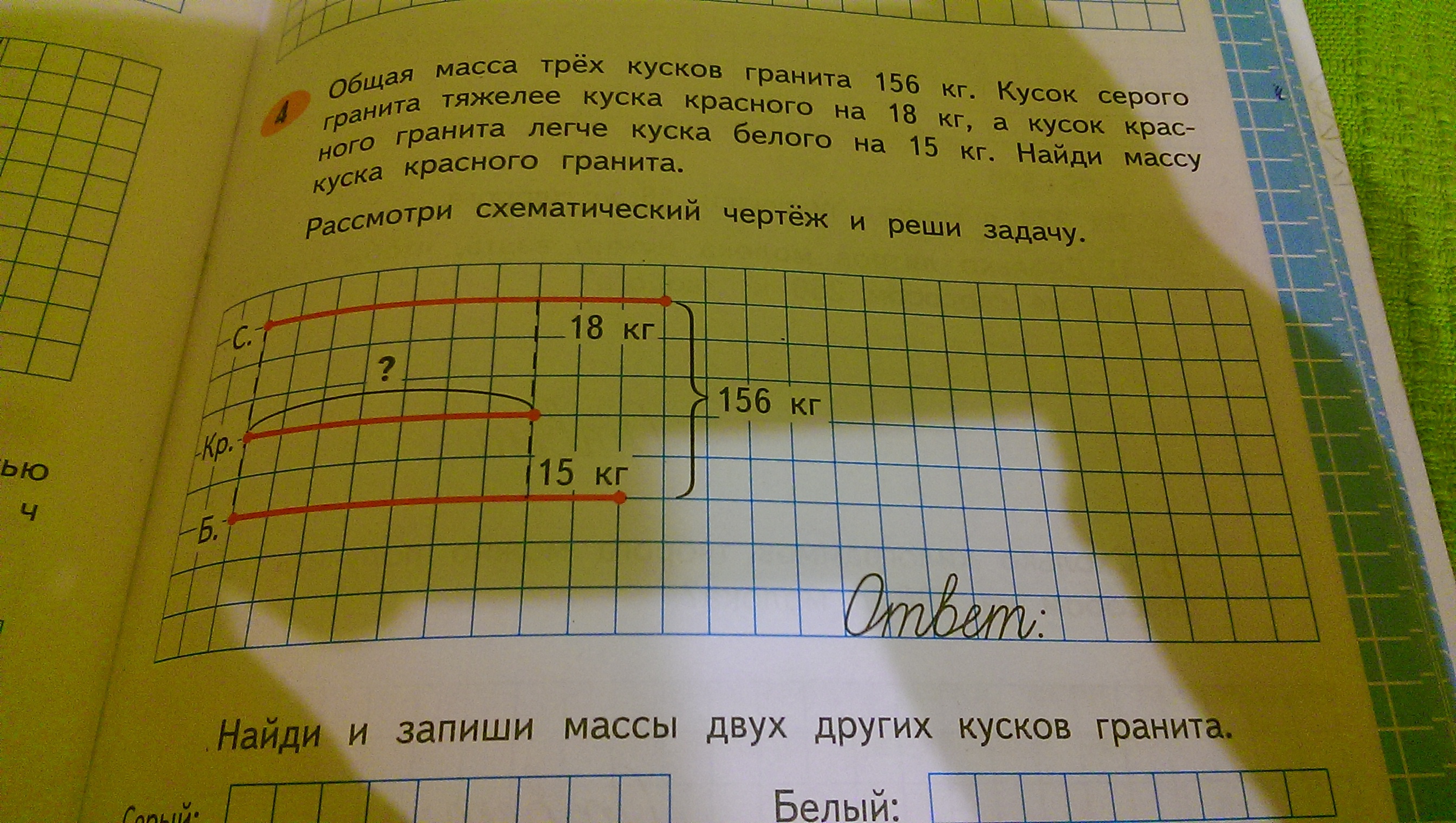 2) 156 - 33= 123 (кг) вес трех кусков гранита , если бы они были равные.