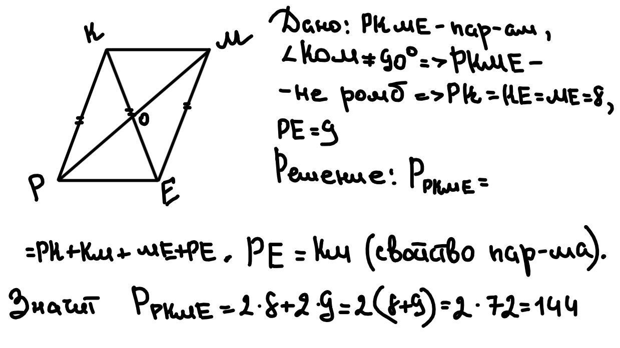 Диагональ КМ параллелограмма РКМЕ делит его на два равнобедренных треугольника со сторонами 8,8 и 9. Найдите периметр этого параллелограмма, если угол между его диагоналями НЕ равен 90°.