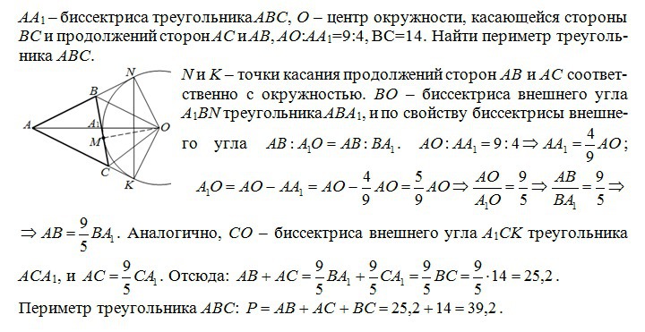 AA1-биссектриса треугольника АВС, О- центр окружности,касающейся стороны ВС и продолжений сторон АС и АВ,АО:АА1=9:4,ВС=14.Найти периметр треугольника АВС.
