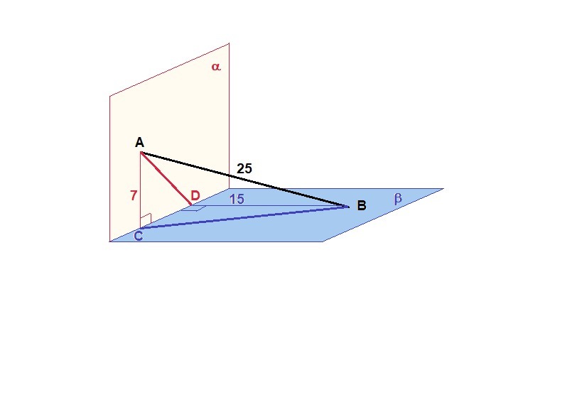 Отрезок длиной 25 см опирается концами на две перпендикулярные плоскости. Расстояние от концов отрезка к плоскостям дор. 7 см и 15 см. Вычислить проекции отрезка на каждую из плоскостей.
