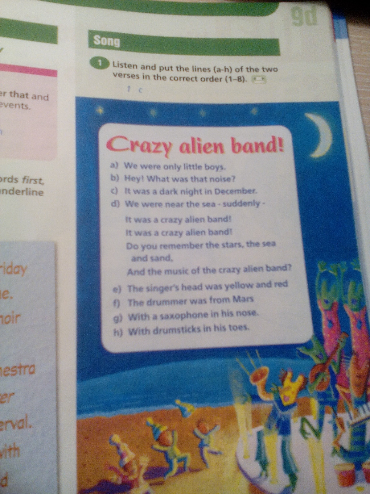 а)мы были только маленькие мальчикиб)Эй, что это за шум?с)это была темная ночь в декабред)Мы были недалеко от моря ( внезапно)это была сумасшедшая группа!это был сумасшедшая группа!вы помните, звезды, море и песок?е)И музыка сумасшедшей группы?е)Голова певицы была желтой и краснойф)ударник был с Марсаж)с саксофоном в носух) с палочками в пальцах ног