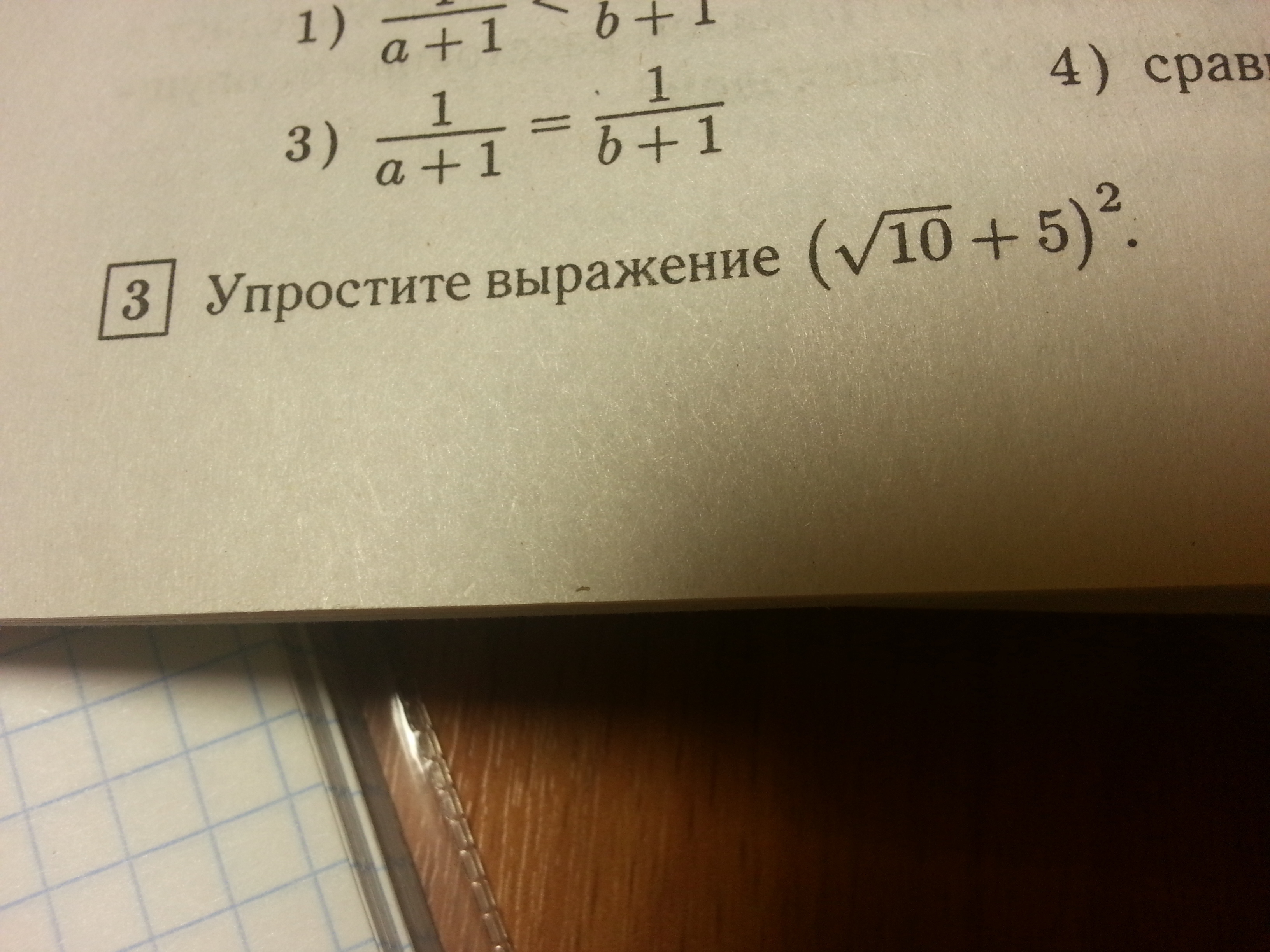 по формуле разлаживаем: корень из 10 в квадрате=10(т.к. корень сокращается)+удвоенное произведение первого и второго(10 корней из десяти)+25
