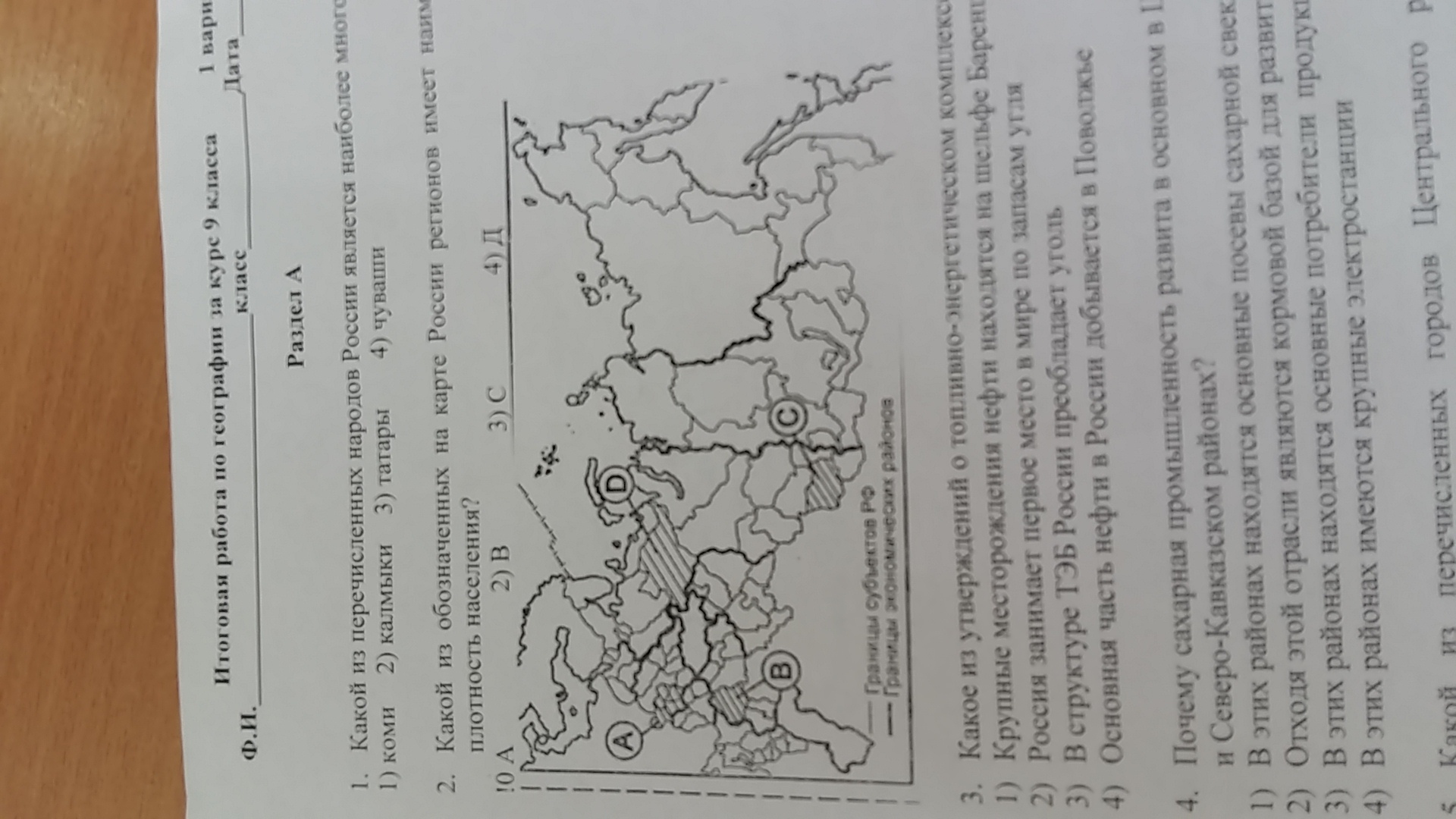 Какой из обозначенных на карте России регионов имеет наибольшую среднюю плотность населения?