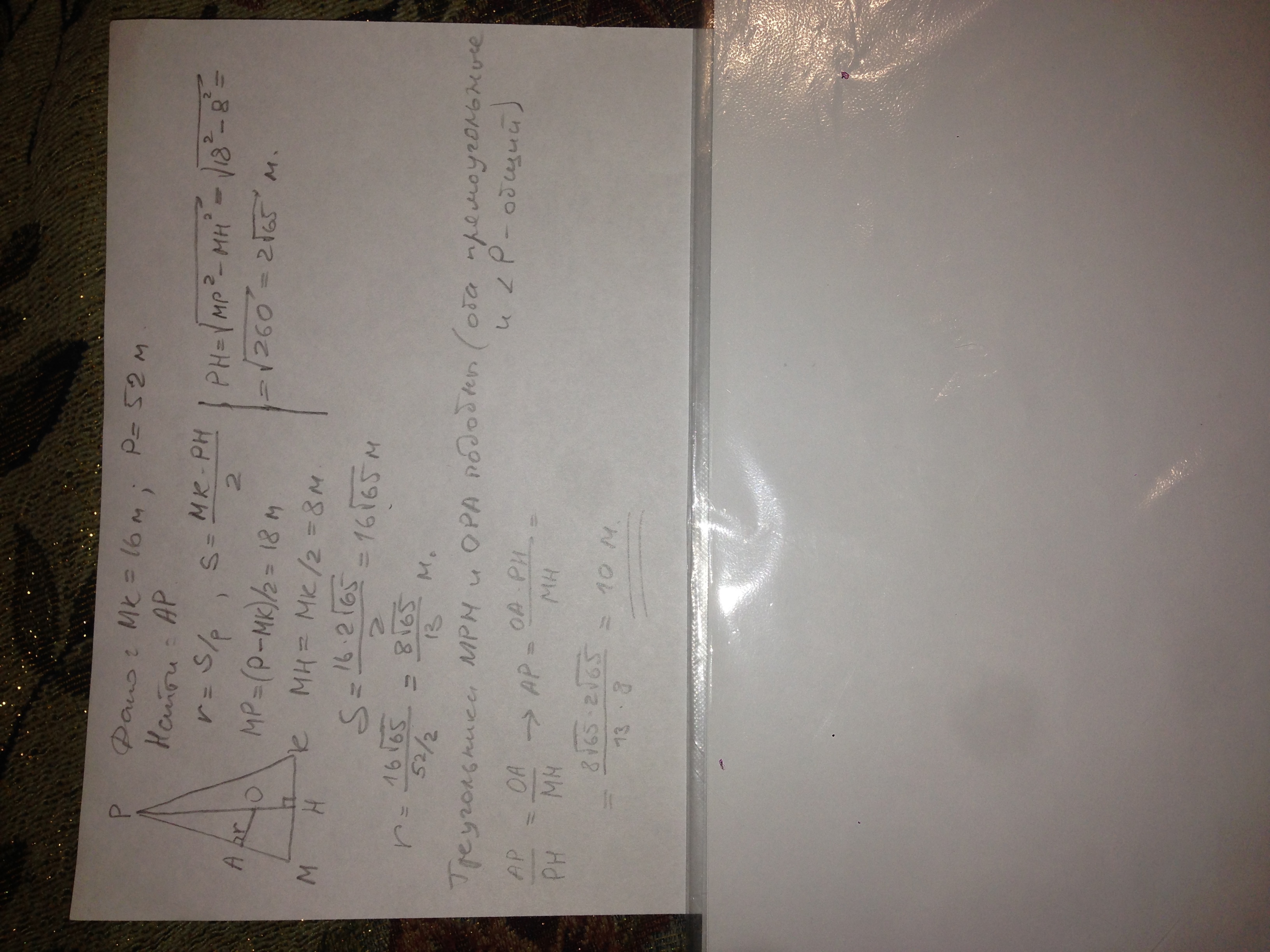 Треугольник MPK равнобедренный, его основание MK равно 16 м, а периметр равен 52 м. Найдите длину отрезка AP (А - точка касания вписанной окружности со
