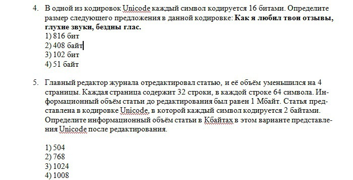 В 4 номере ответ 1, так как мы считаем сколько букв, пробелов и символов. И умножаем на 16.