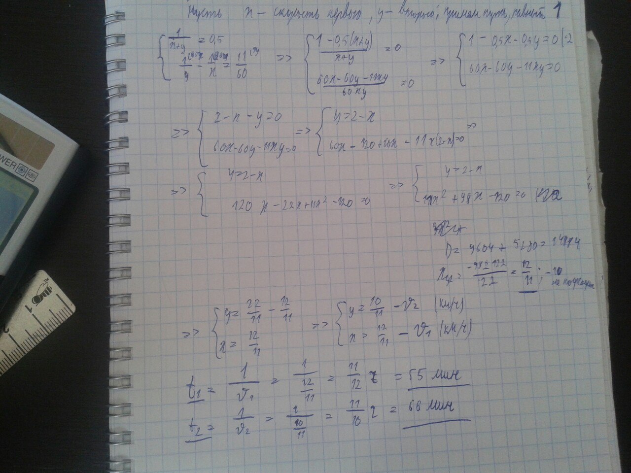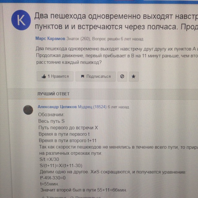 Два пешехода одновременно выходят навстречу друг другу их пунктов А и Б, встречаются через полчаса. Продолжая движение, первый прибывает в В на 11мин раньше, чем второй. За какое время преодолел расстояние каждый пешеход