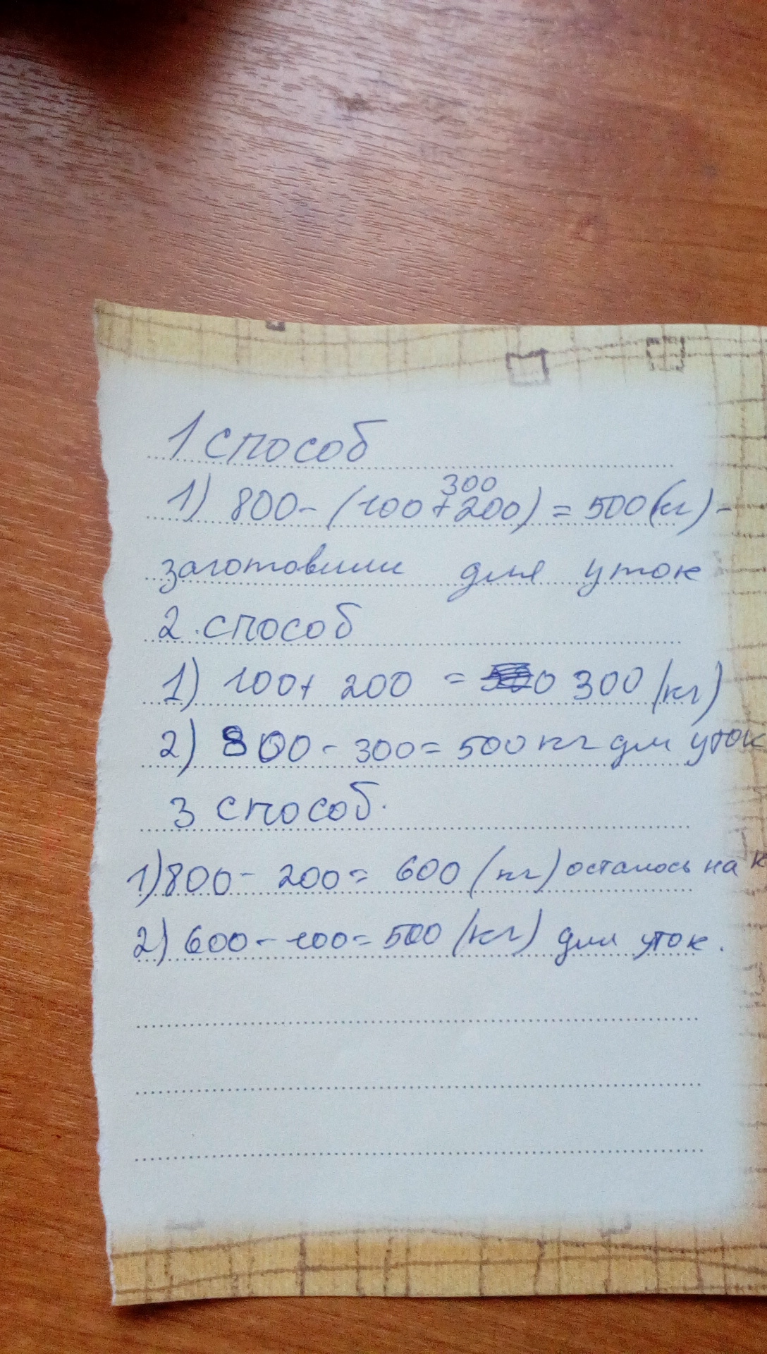 Реши задачи разными способами, если это возможно. На птицеферме заготовили 800 кг корма. Из них 200кг для гусей, 100 кг для кур, а остальное для уток. Сколько килограммов корма заготовили для уток?