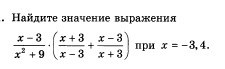 (x-3)/(x^2+9)×((x+3)^2+(x-3)^2)/(x-3)(x+3))=(x-3)/(x^2+9)×((x^2+6x+9+x^2-6x+9)/(x^2-9))=(x-3)/(x^2+9)×((2x^2+18)/(x^2-9))=(x-3)/(x^2+9)×(2(x^2+9)/(x-3)(x+3))=сокращение=2/(х+3)=2/(-3,4+3)=2/(-0,4)=-5.