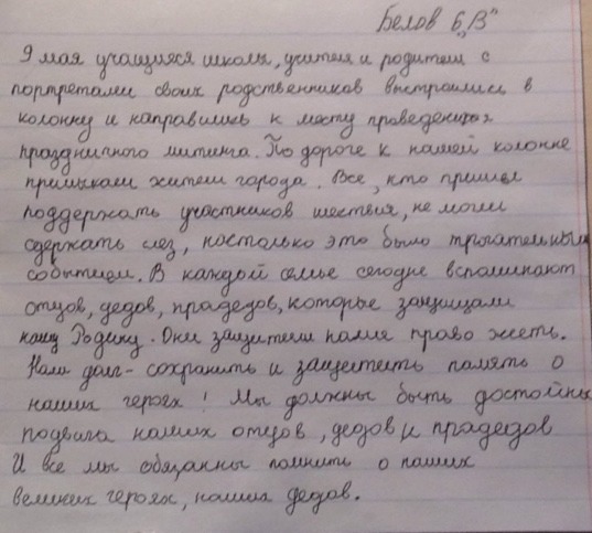 Мои прадеды прошли всю войну. Один из них, Николай Кузьмич, вернулся домой. Другого прадеда, Виталия Петровича, смертельно ранили, отчего ему не суждено было встретиться с супругой и дочерьми. Я помню историю всех моих родственников. И каждый год 9 мая мы с родителями отправляемся на шествие, которое помогает показать, что никто не забыт, ничто не забыто...