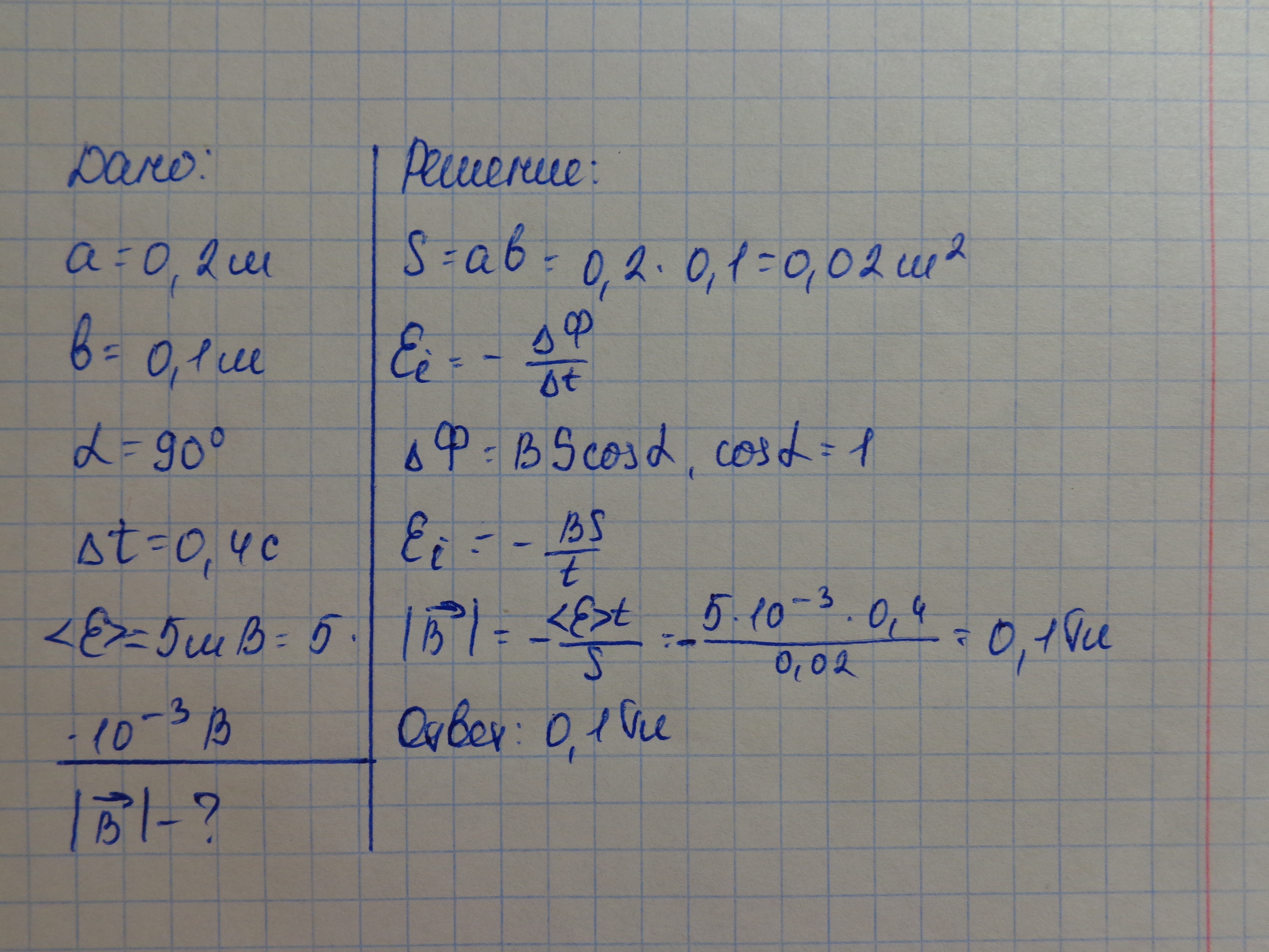 Прямоугольная проводящая рамка размером 0.20х0.10 м помещена в однородное магнитное поле перпендикулярно линиям индукции магнитного поля.Определите модуль индукции магнитного поля,если при его исчезновении за промежуток времени дельта t=0,40 в рамке наводится средняя ЭДС самоиндукции =5,0 mB