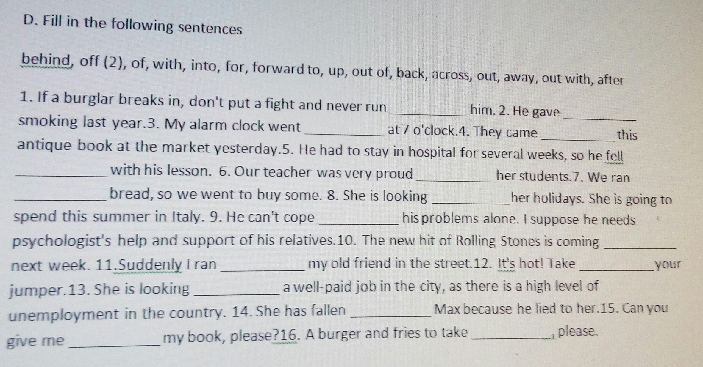 5. He had to stay in hospital for several weeks, so he fell _____behind_____ with his lesson.