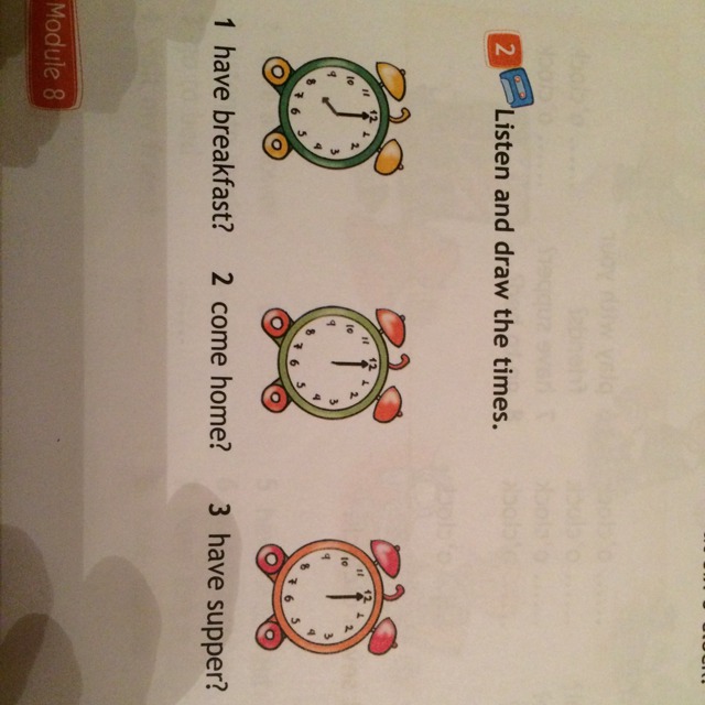 Listen and draw the times , 1) have breakfast, 2) come home , 3) have supper , 4) go to bed ?