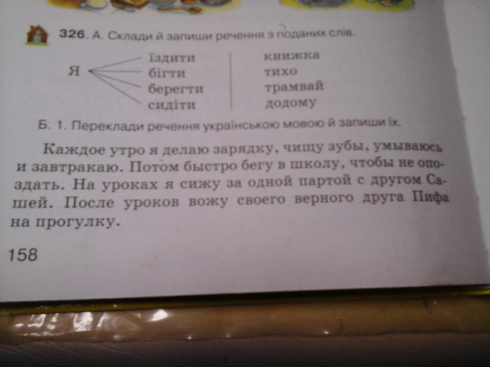 Кожного ранку я роблю зарядку, чищу зуби, умиваюся та снідаю. Потім швидко біжу до школи, щоб не спізнитися. На уроках я сиджу за однією партою з другом Сашком. Після уроків виводжу свого вірного друга Піфа на прогулянку.