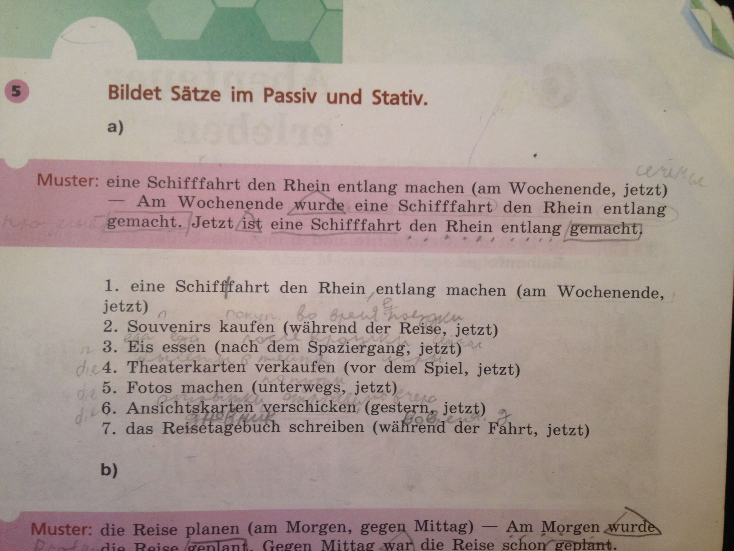 Während der Reise wurden Souvenirs gekauft. Jetzt sind Souvenirs gekauft. Nach dem Spaziergang wurde Eis gegessen. Jetzt ist das Eis gegessen. Vor dem Spiel wurden Theaterkarten verkauft. Jetzt sind Theaterkarten verkauft. Unterwegs wurden Fotos gemacht. Jetzt sind Fotos gemacht. Gestern wurden Ansichtskarten verschickt. Jetzt sind Ansichtskarten verschickt. Während der Fahrt wurde das Reisetagebuch geschrieben. Jetzt ist das Reisetagebuch geschrieben.