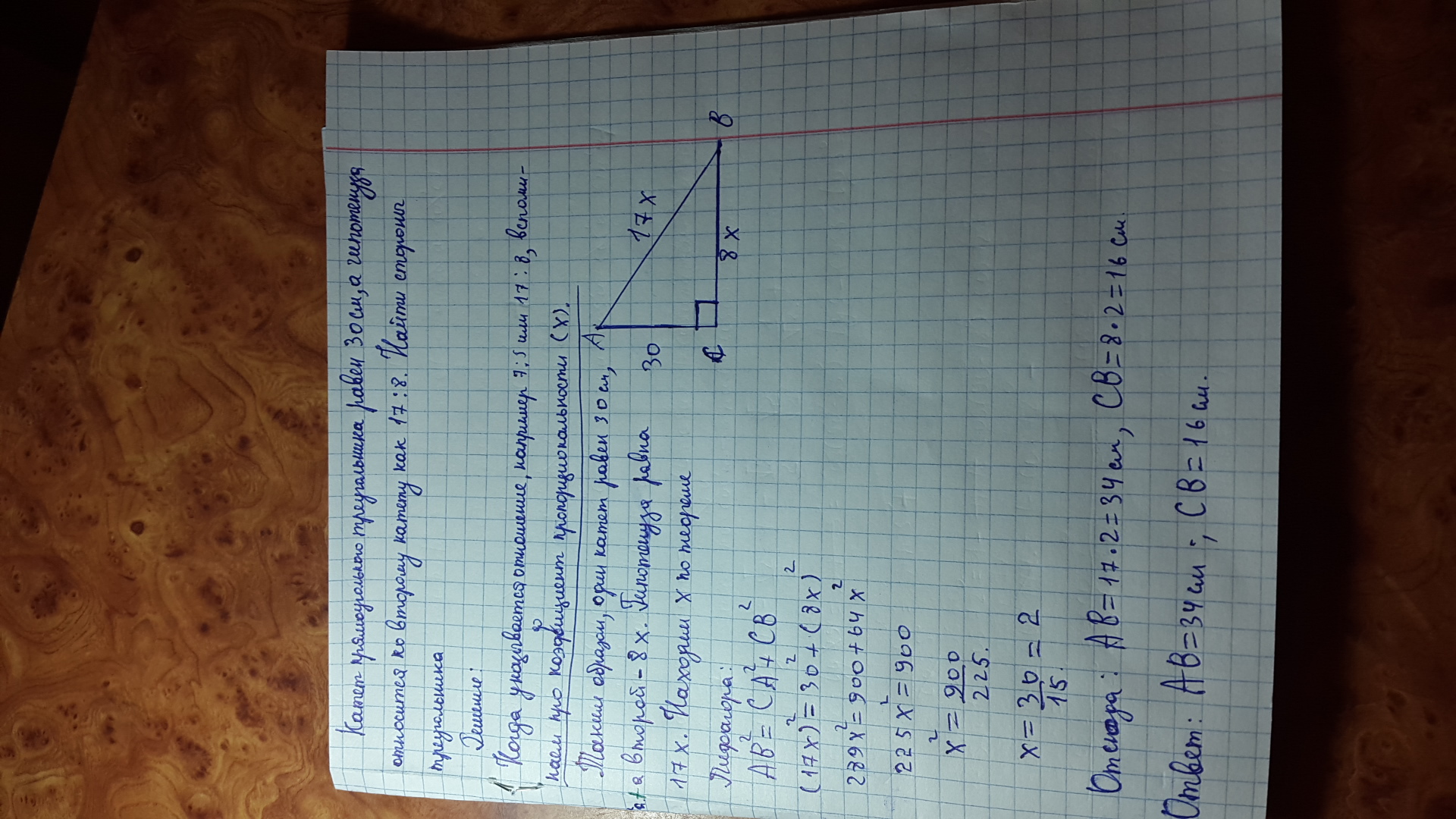 Катет прямоугольного треугольника равен 30 см, а гипотенуза относится ко второму катета как 17: 8. Найдите стороны треугольника .