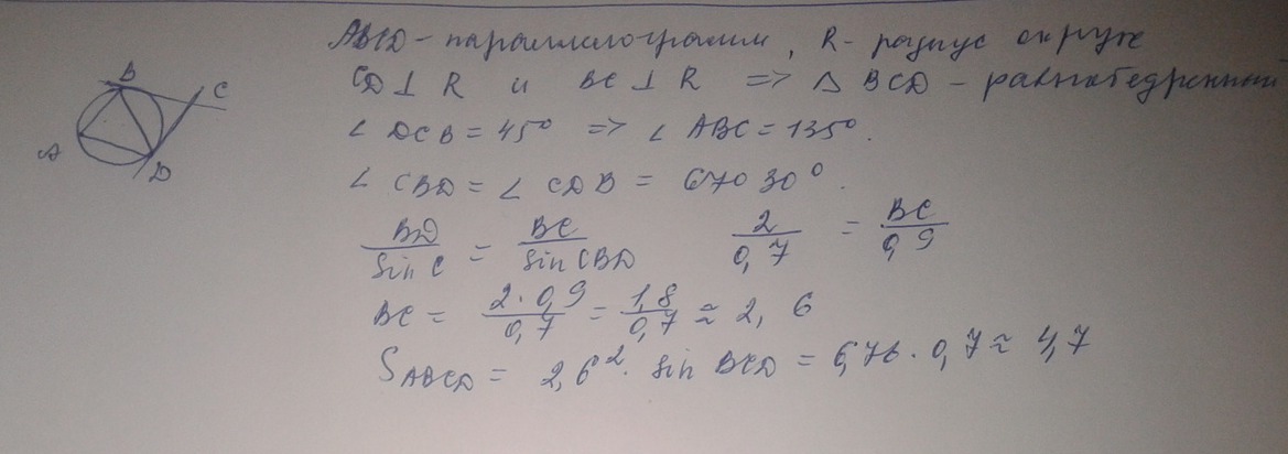 Известно, что ABCD - параллелограмм, BD = 2, угол ACB равен 45о. Прямая CD касается окружности, описанной около треугольника ABD. Найдите площадь параллелограмма ABCD