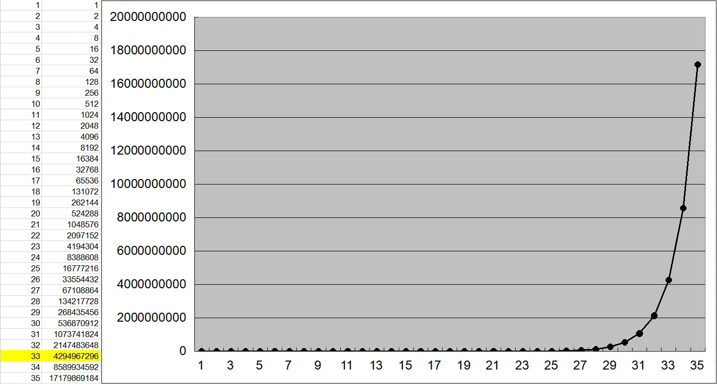 В банку попал один микроб, и через 35 минут банка была наполнена микробами, причём известно, что количество микробов ежеминутно удваивалось. За сколько минут банка была наполнена микробами на четверть? Для наглядности составьте таблицу и график, показывающие динамику роста микробов.
