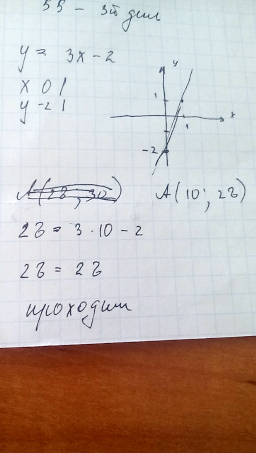 Помогите пожлуйста.Срочно Номер1)Постройте график функцииy=3x-2 б)Определите проходит ли график функции через точку А(10;28) Номер2)3 бригады за смену изготовили за смену 190дет.2бригала изготов.на на 5дет.больше,чем первая бригада,и на 15больше,чем третья. Сколько дет. изготовила каждая бригада