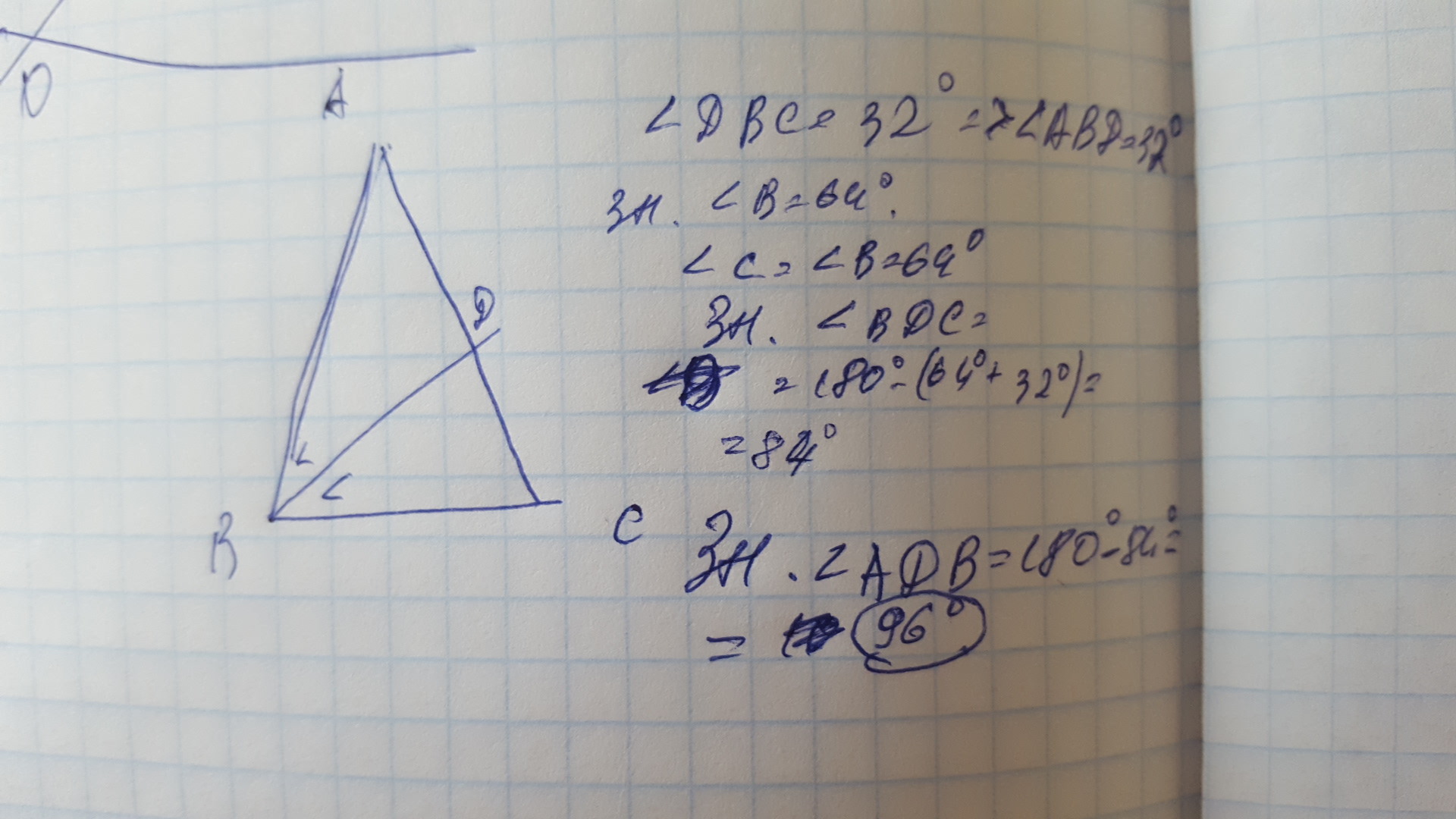 в равнобедренном треугольнике ABC проведена биссектриса BD.Найдите угол ABC и угол ADB,если угол DBC равен 32