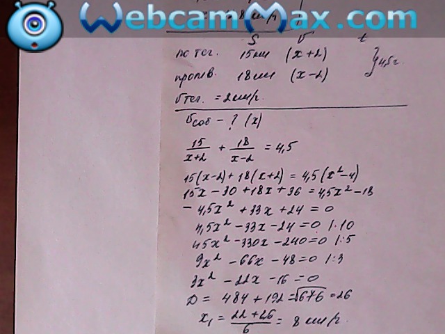 Моторная лодка прошла 15 км по течению реки и 18 км против течения реки,затратив на весь путь 4.5 часа.Скорость течения реки равна 2км/ч.Какова соьственная