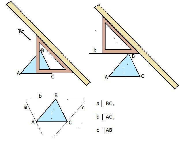 начертите треугольник. Через каждую вершину этого треугольника с помощью чертежного угольника и линейки проведите прямую , параллельную противоположной стороне