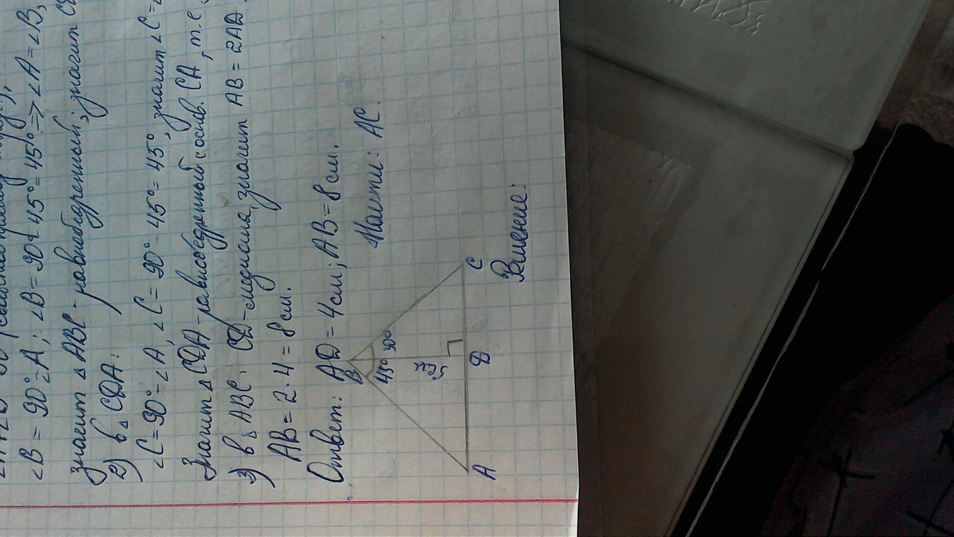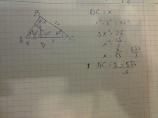 Прошу помощи у лучших умов проекта. Дан треугольник АВС. Высота ВD равна 5 см, угол АВD равен 45°, а угол СВD равен 30°. Найти АС.