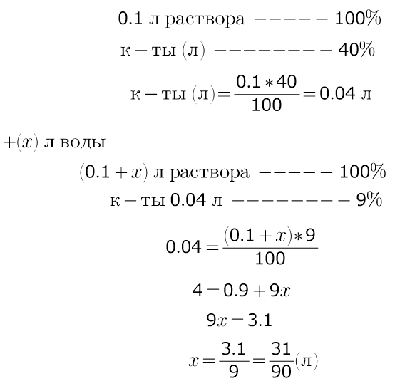 Сколько воды надо добавить к 0,1 л. раствора, содержащего 40% уксусной кислоты, чтобы получить 9- процентный раствор этой кислоты?