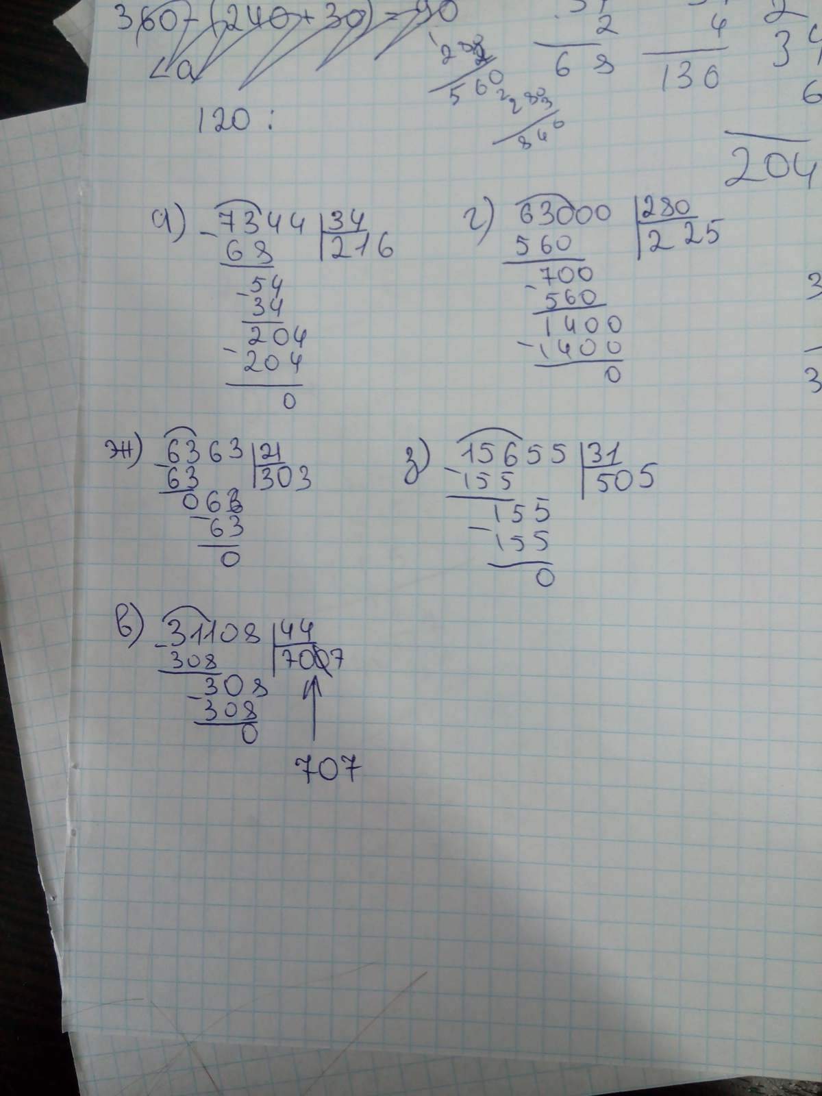 Найдите частное а)7344:34; г)63000:280; ж)6363:21; б)22220:55; д)252800:800; з)15655:31; в)31108:44; е)20720:40; и)10800:48