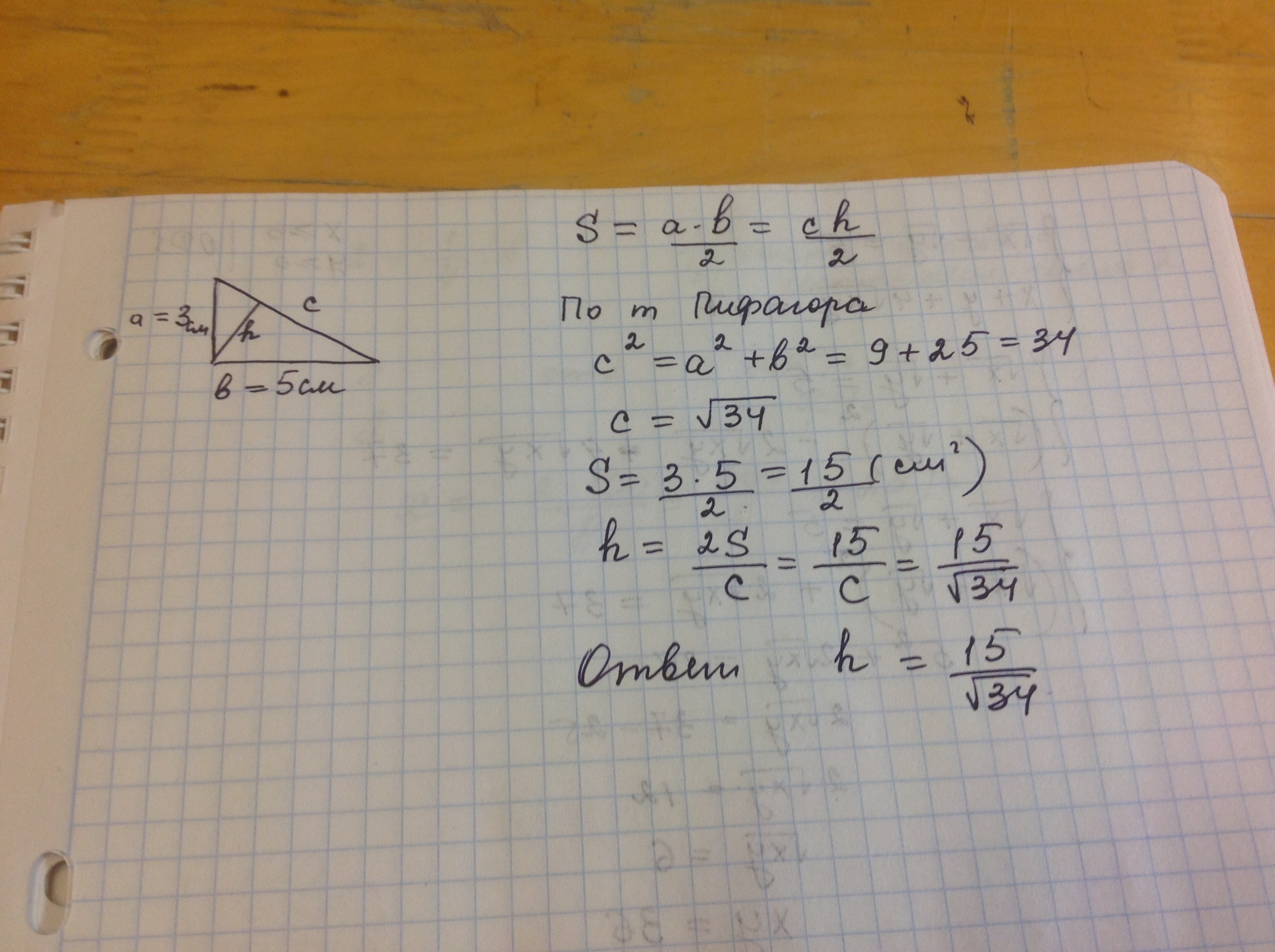 Найдите высоту опущенную на гипотенузу прямоугольного треугольника если его катеты равны 3 сантиметра и 5 см