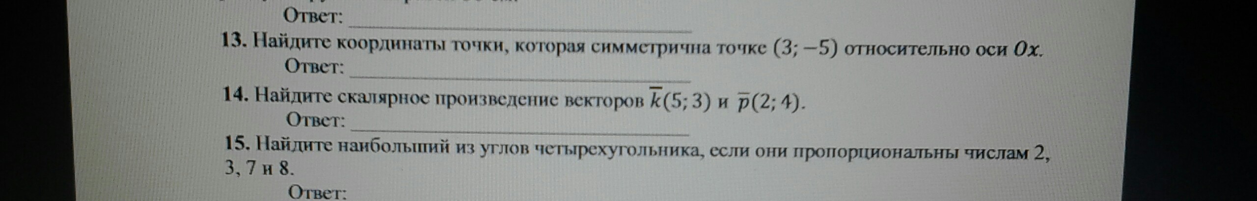 13. Если симметрия относительно оси 0x, то меняешь знак координаты y. Если симметрия относительно оси 0y, то меняешь знак координаты x. Если симметрия относительно центра координат, то меняешь знаки обеих координат.