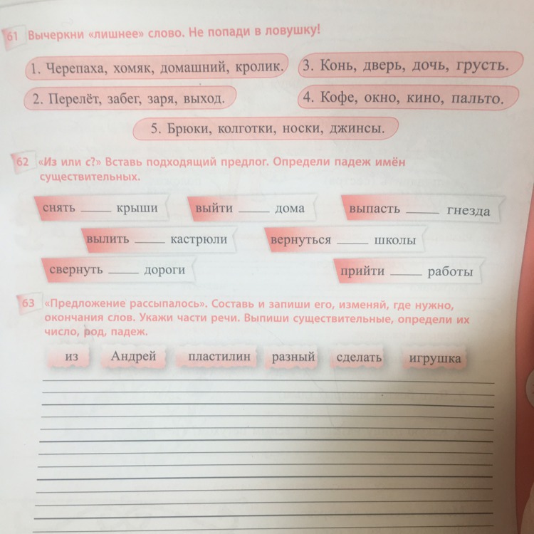 с крыши, из дома, из гнезда, из кастрюли, из школы, с дороги, с работы