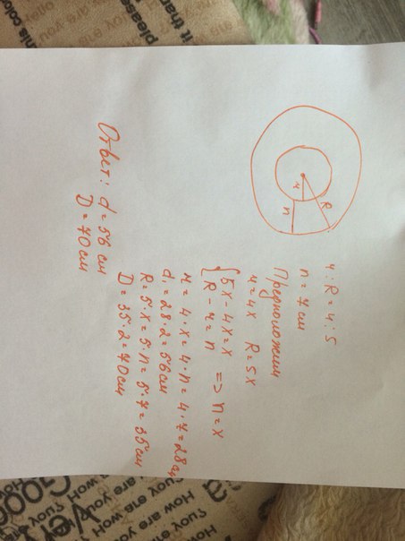 РАДИУСЫ ДВУХ КОНЦЕНТРИЧЕСКИХ ОКРУЖНОСТЕЙ ОТНОСЯТСЯ КАК 4:5. НАЙДИТЕ ИХ ДИАМЕТРЫ, ЕСЛИ ШИРИНА КОЛЬЦА, ОБРАЗОВАННОГО ЭТИМИ ОКРУЖНОСТЯМИ, РАВНА 7 СМ.