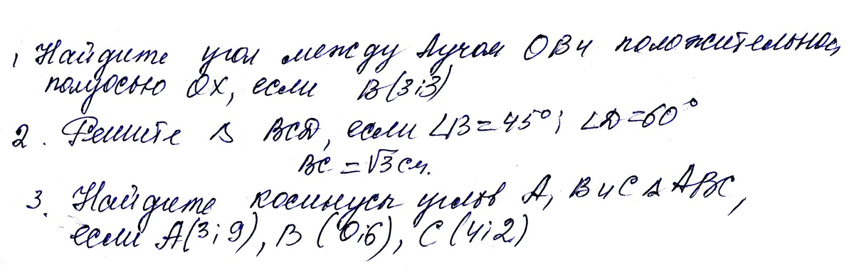 1)Найдите угол между лучом ОВ и положительной полуосью ОХ, если В(3;3) 2)Решите треугольник ВСD, если угол В=45*: угол D=60* ; ВС=корень из 3 см. 3) Найдите косинусы углов А, В и С треугольника АВС, если А(3;9), В (0;6), С(4;2).