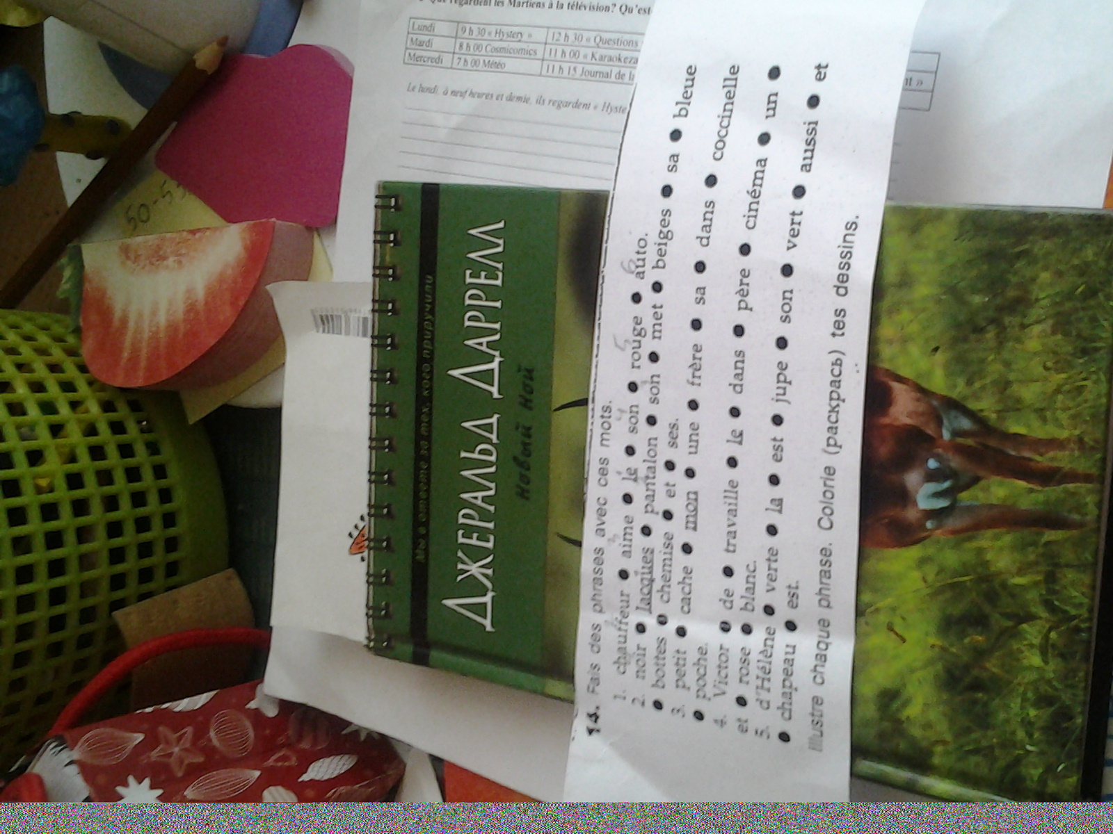 1) Le chauffeur aime son rouge auto. 2) Jacques met son pantalon noir, sa chemise bleue et ses bottes beiges. 3) Mon petit frère cache une coccinelle dans sa poche. 4) Le père de Victor travaille dans un cinéma rose et blanc. 5) La jupe d'Hélène est verte et son chapeau est aussi vert
