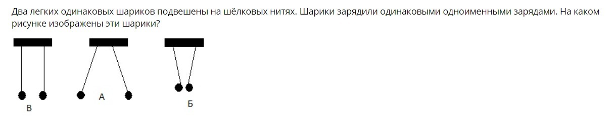 Два легких одинаковых шарика подвешены на шелковых нитях. Шарики зарядили одинаковыми одноименными зарядами. На каком рисунке изображены эти шарики?