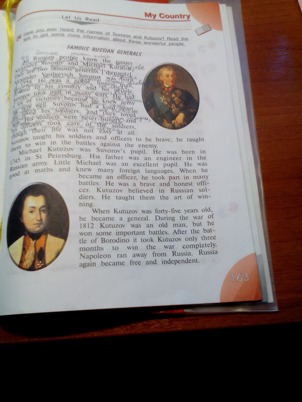 Все люди знают имена Алексанлр Суворов и Михаил Кутозов. Они два известных генерала. Александр Васильевич Суворов родился в тысяча семьсот двадцать девятом году. Он был благородным,честным человеком,Суворов принимал участие во многих войнах.У него было много побед,потому что он знал армейскую жизнь очен хорошо.Суворов имел доброе сердце,он любил своих солдат,и они любили его.Его солдаты никогда не были голодными,хотя жизнь их была не легка.Суворов учил солдат и офицеров быть храбрыми,учил их побеждать в битвах против врагов.