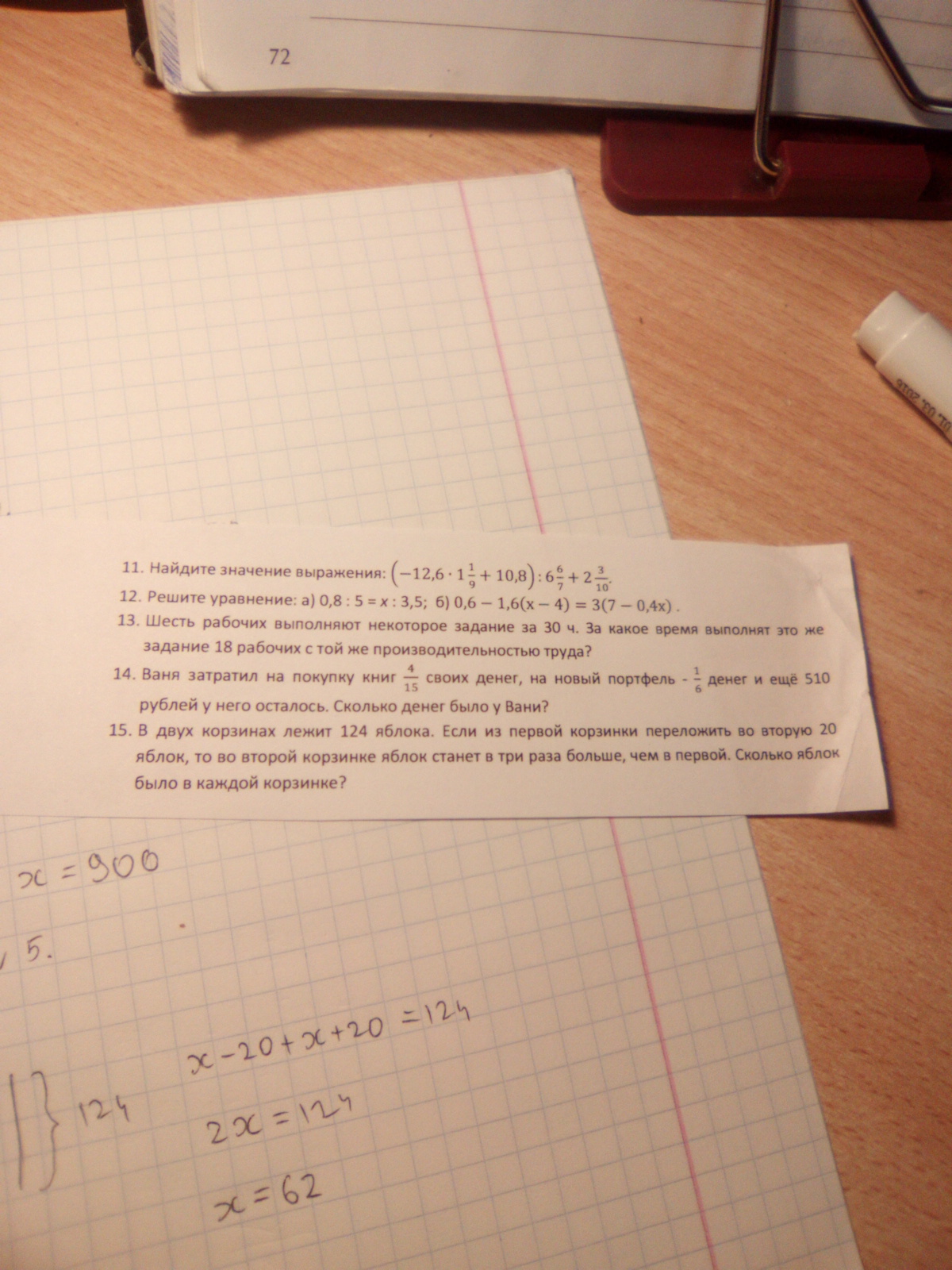 Пусть х - яблок в 1ой корзине, 3(x -20) - яблок во 2ой корзине, x + 3(x-20) = 124 -яблок в 2ух корзинах