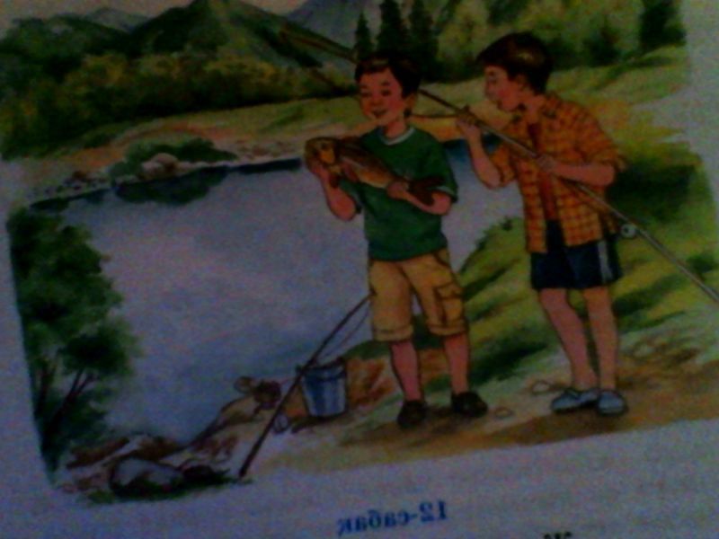 Бұл жерде балдар өзеннің алдында тур. Балалар екеүі достар.Олар балық аулап жатыр. Балалар үлкен балық ұстап оны әр жағынан көріп жатыр. Өзі жазда балықтар көп ауланады.