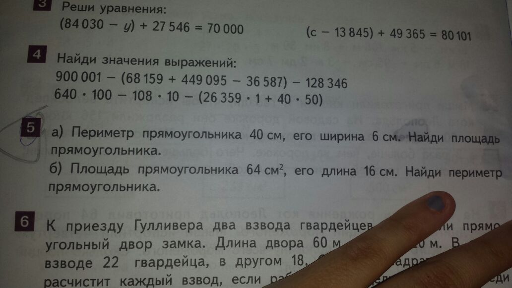 а) P=a+a+b+b 40=6+6+? 1) 40-12=28 (см) 2) 28/2=14 (см) P=6+6+14+14=40 a=6, b=14 S= 14*6=84 (см кв) Ответ площадь прямоугольника 84 в квадрате. б) 1) 64/4 =16 (см) 2) P= 4+4+16+16=40 (см) Ответ периметр равен 40 см. :)
