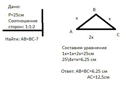 одна из сторон равнобедренного треугольника в 2 раза больше другой. Найдите длину меньшей стороны треуг. если его пириметр равен 25см