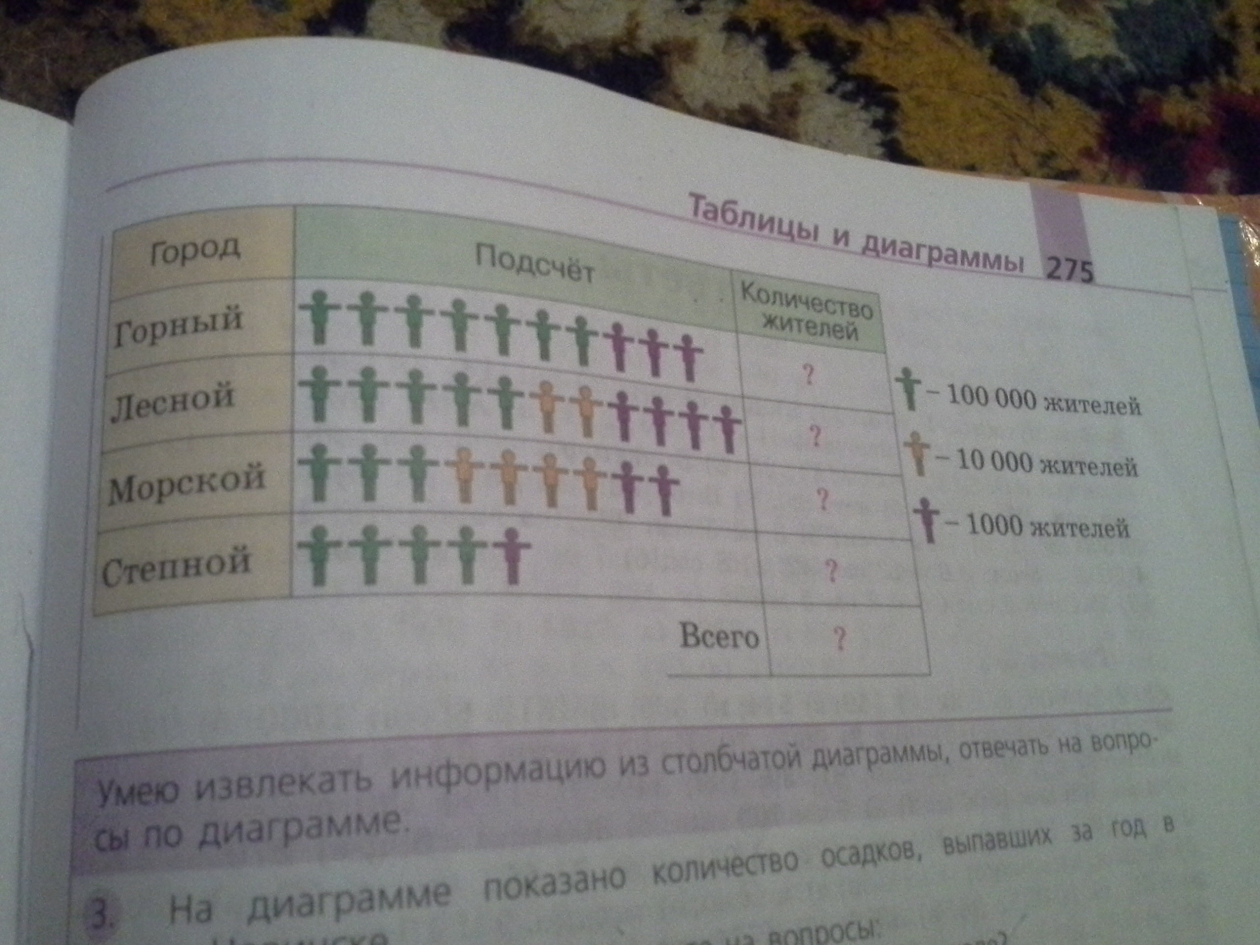 в таблиице указоно количество жителей в четырех городах используя таблицу ответе на вопросы А)В КАКОМ ГОРОДЕ МЕНШЬШЕ ВСЕГО ЖИТЕЛЕЙ?Б)В КАКОМ ГОРОДЕ БОЛЬШЕ ВСЕГО ЖИТЕЛЕЙ?В)СКОЛЬКО ЖИТЕЛЕЙ В ЛЕСНОМ?Г)СКОЛЬКО ВСЕГО ЖИТЕЛЕЙ ВО ВСЕХ ГОРОДАХ