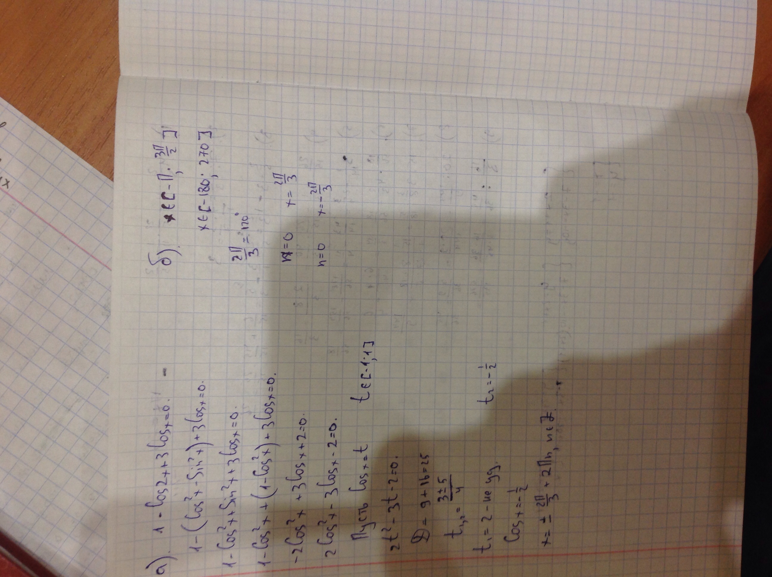 Решите уравнение 1-cos2x+3cosx=0 и найдите корни , принадлежащие отрезку [-п; 3п/2]