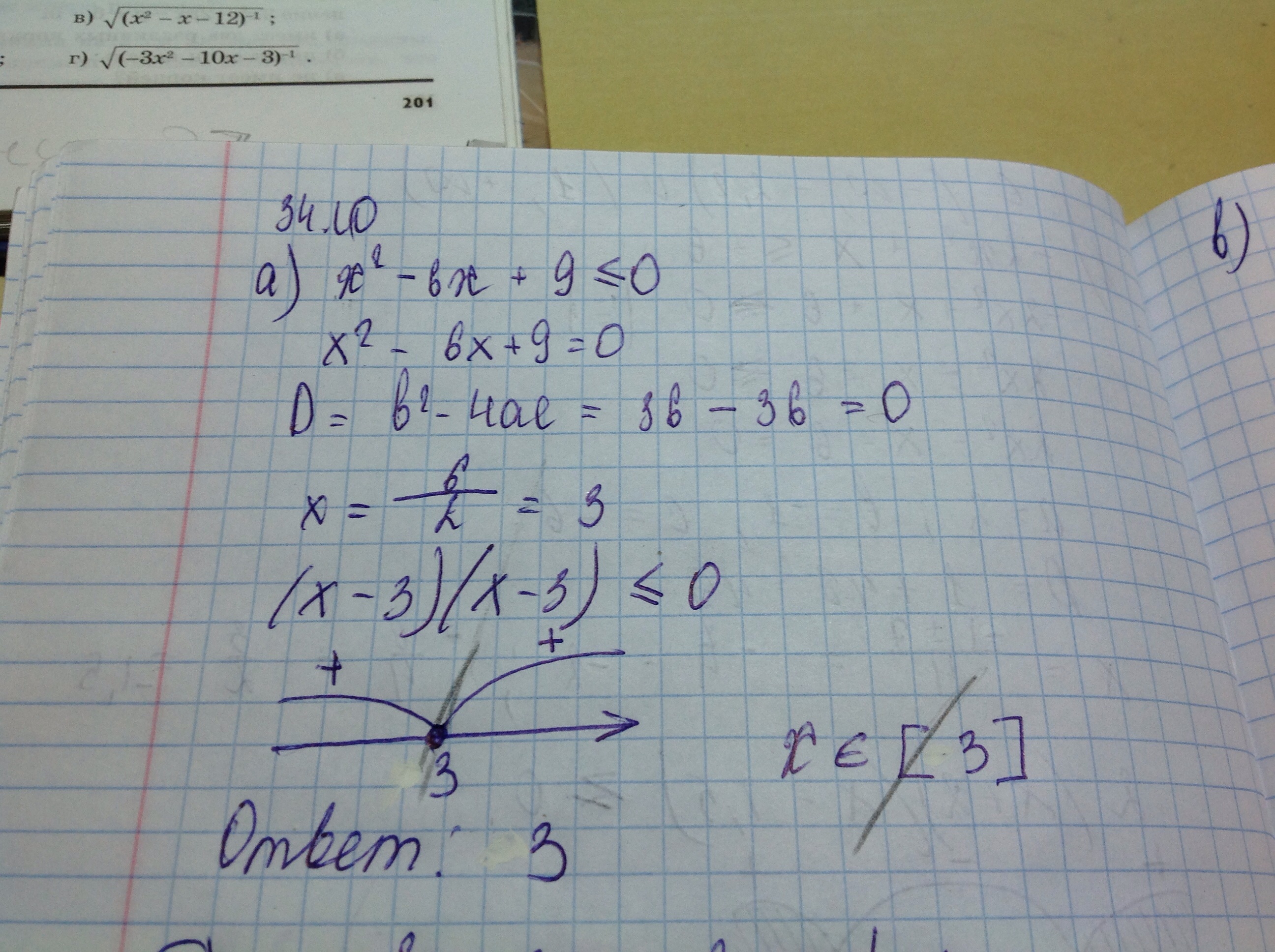 (х-3)(х-3)≤0, подставляем х=3 и получим (3-3)(3-3)≤0 , 0≤0 - верно!